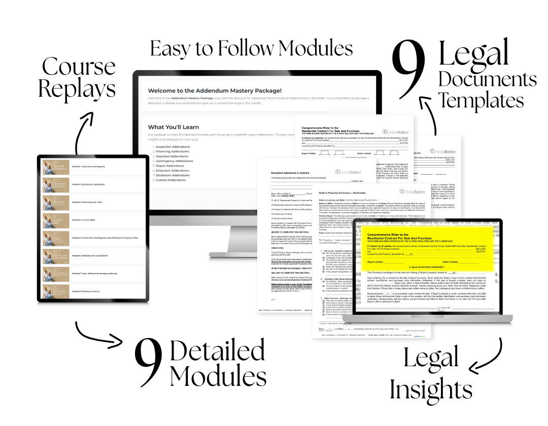 Unlock the power of addendums in real estate with our Addendum Mastery Package. This comprehensive package includes 9 modules with instructional videos on various addendums, from inspections to financing. Gain essential insights and strategies to enhance your expertise. Elevate your real estate knowledge today!